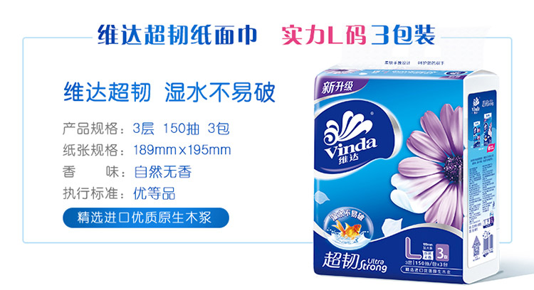 维达(Vinda) 抽纸 超韧系列 软抽3层150抽*3包(大规格)