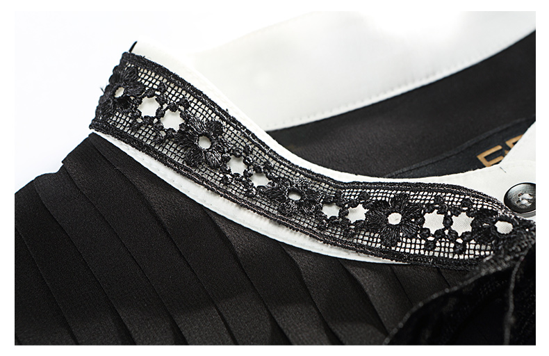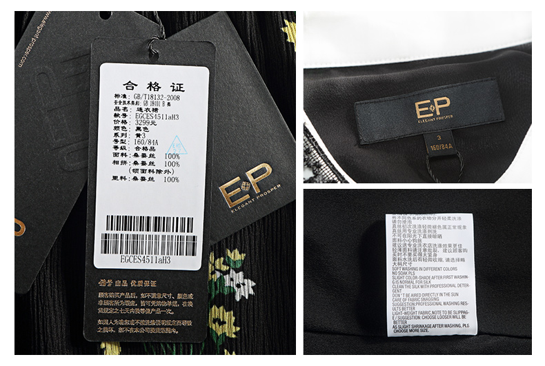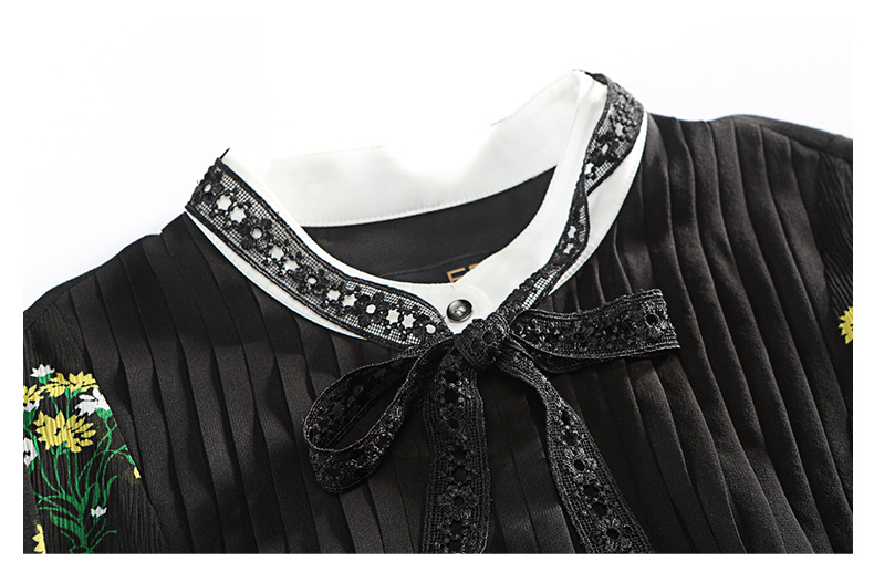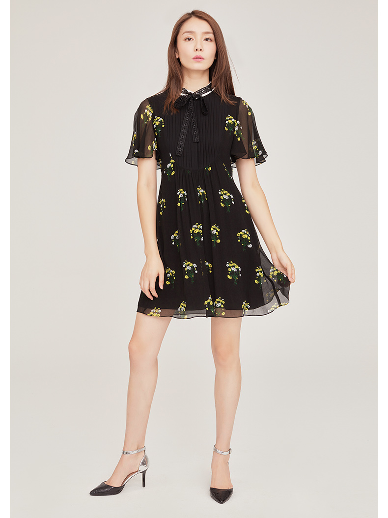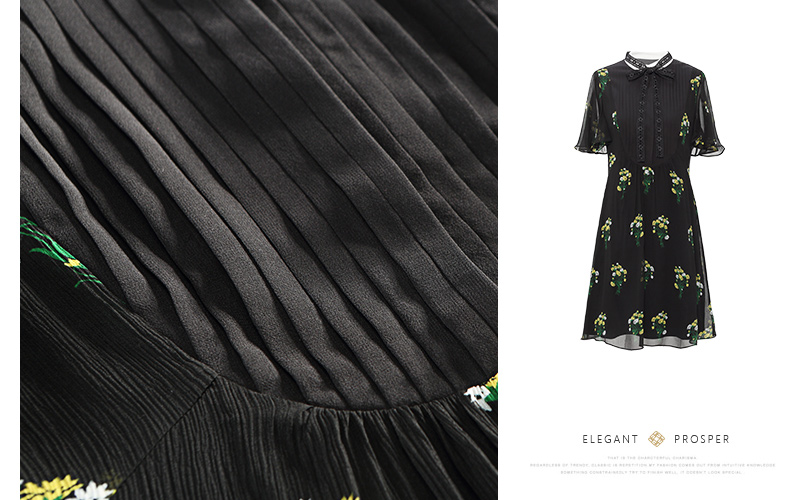 EP 雅莹2017夏新品专柜热卖蕾丝系带蝴蝶结印花风琴褶连衣裙4511a 黑色 2/S 黑色 S