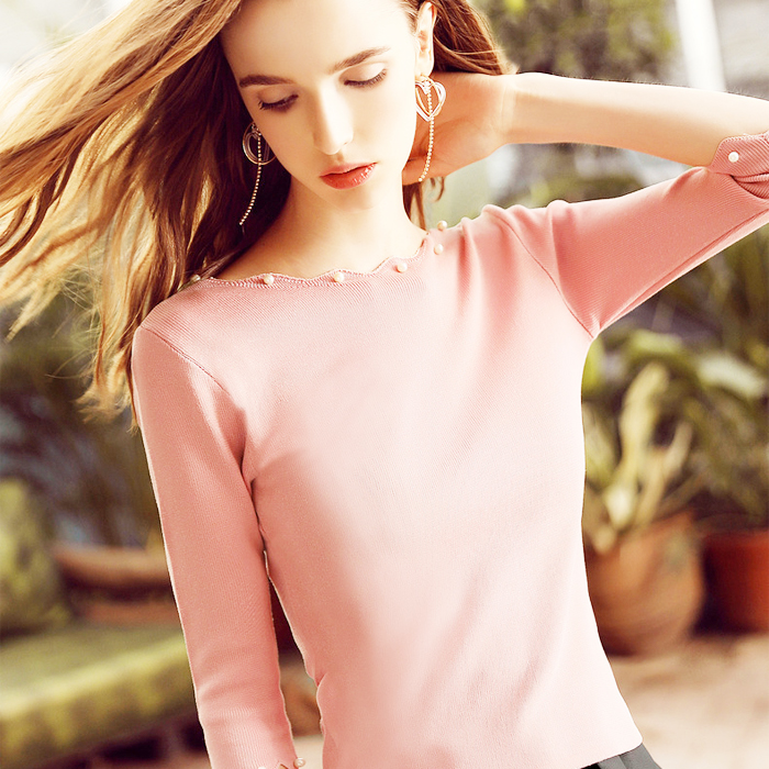 糖力2017春装新款欧美 女装裸色五分袖收腰连衣裙显瘦裙子 裸色 杏色 S